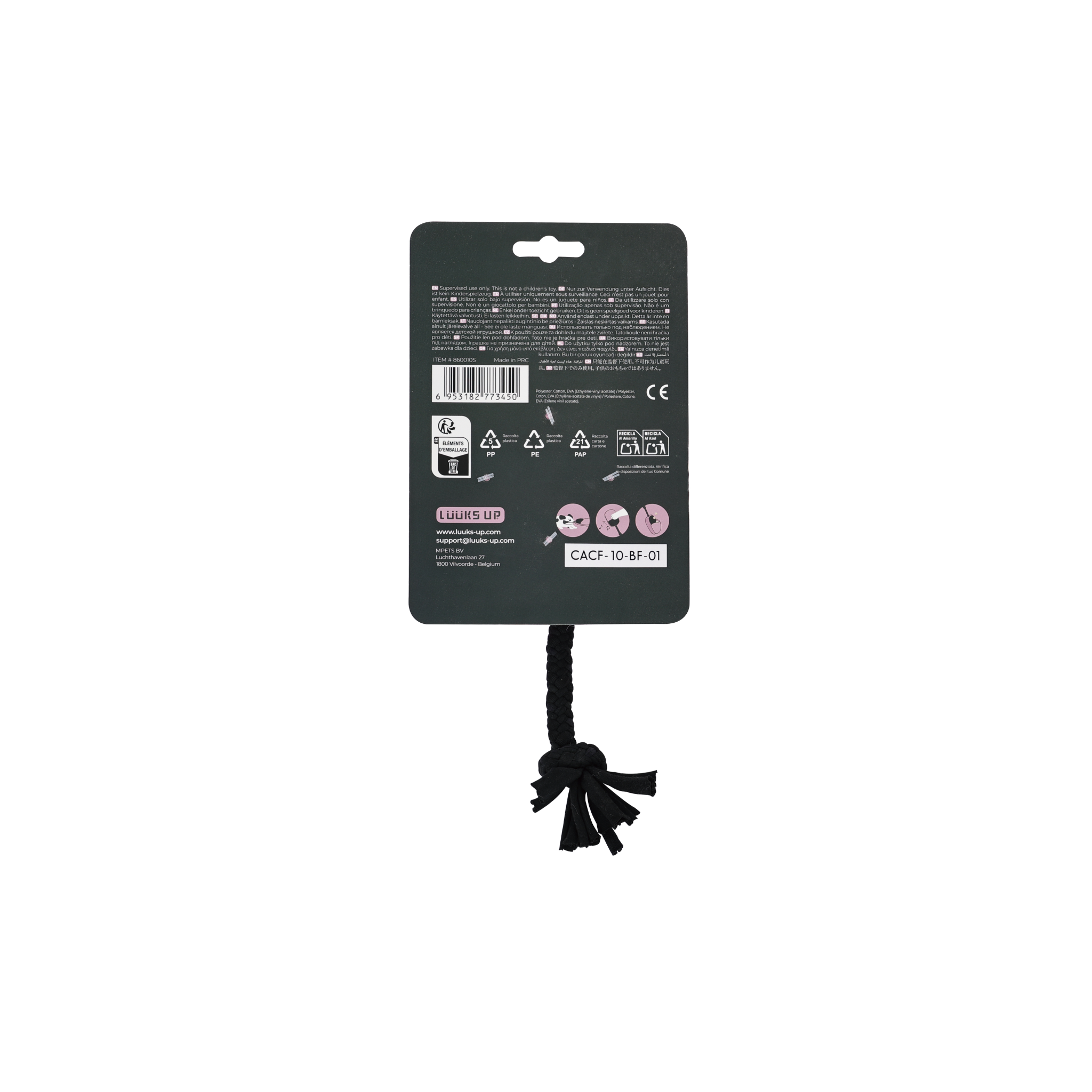Designed to keep dogs engaged, this toy features a built-in squeaker that adds playful sound and encourages longer, more energetic play sessions. The sturdy tug rope is made from recycled material, making it a more eco-friendly choice for pet parents who care about sustainability.